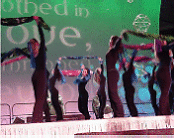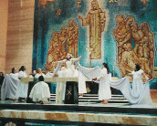Two visual examples of the totally pagan rituals that have replaced the Holy Sacrifice of the Mass. To the left is the 2002 liturgical dancers at the Los Angeles Youth Day 2002 in Anaheim with the blessing of Cardinal Roger Mahony as celebrant; and to the right above is a liturgical dance performance in bare feet, not during a Mass but illegally done in the sanctuary at St. Sebastian's in Akron, Cleveland Diocese with the blessing of Bishop Anthony Pilla.